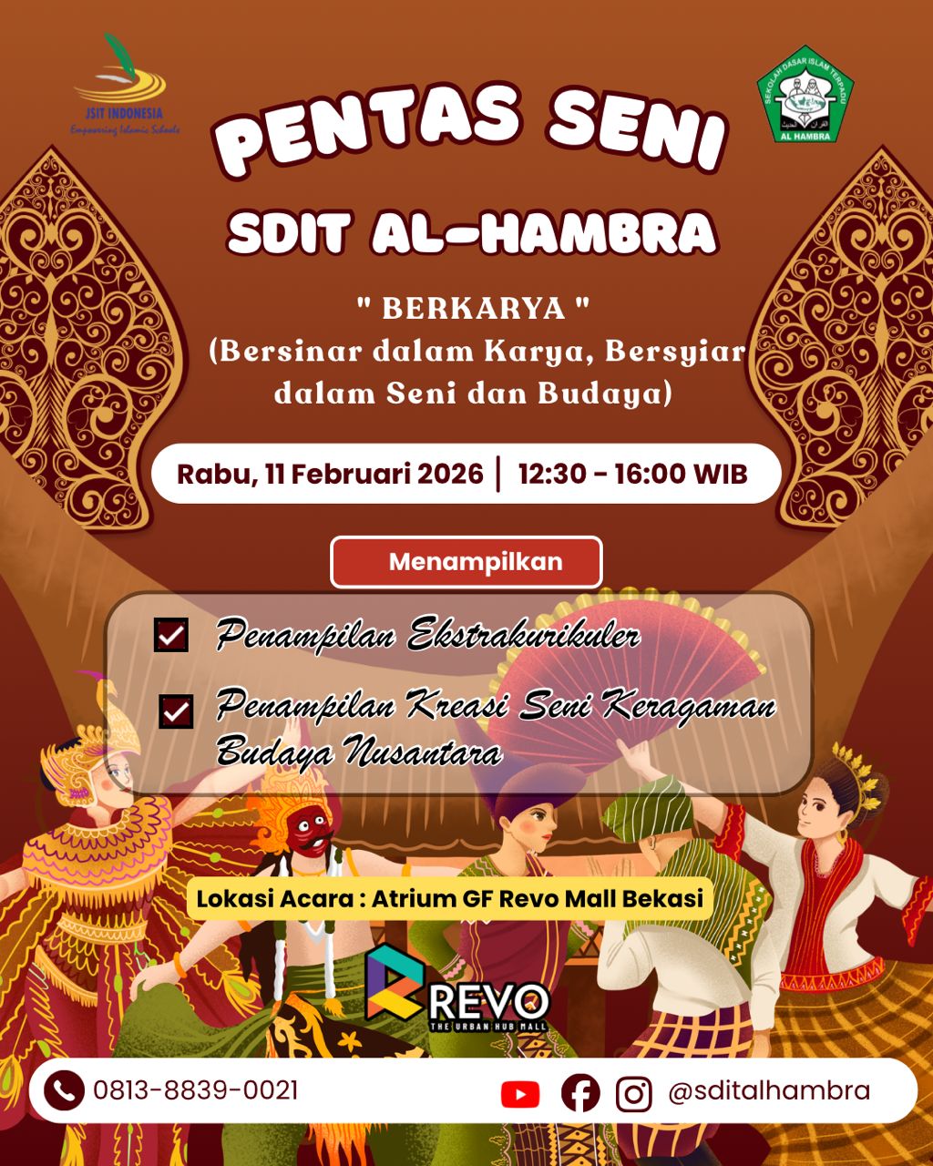 SDIT Al-Hambra dengan bangga mempersembahkan Pentas Seni penuh warna dan budaya Nusantara! Mari hadir dan saksikan penampilan istimewa dari para siswa yang akan menampilkan kekayaan seni daerah Indonesia. 🇮🇩✨